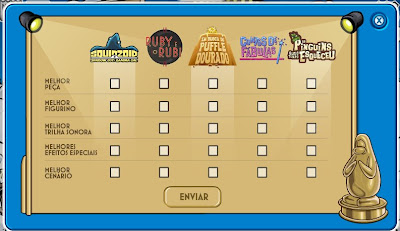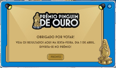 Mudando de assunto, nossa equipe queria agradecer a todos os pinguins que votaram no Prêmio Pinguim de Ouro! A vencedora da categoria melhor peça - Em Busca do Puffle Dourado - já está em cartaz no Palco.